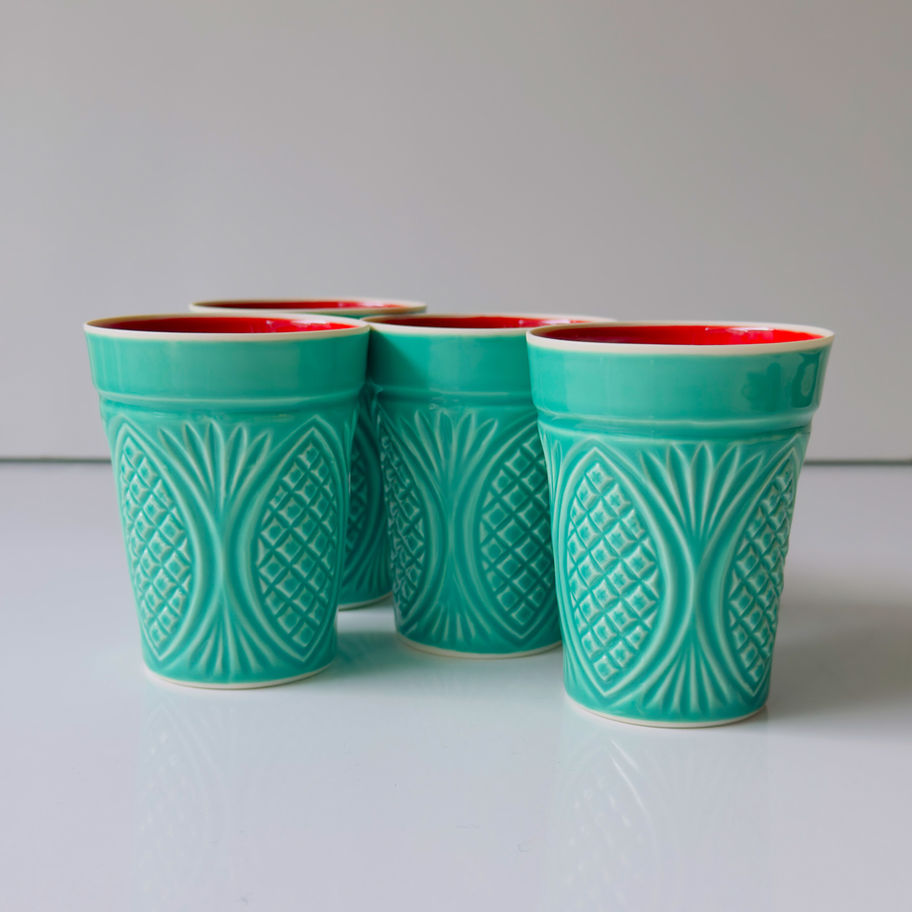 The original late 19th-century Ottoman Glass Factory produced ornamented, cast glass tumblers in a neoclassical style, which are now rare finds, seen only in flea markets and antique stores. By re-appropriating and reissuing them as cast porcelain pieces glazed in striking colors, Santimetre gave these designs a second life, bringing joy and beauty to contemporary homes.